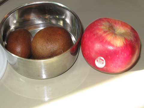 左の茶色いのは、オフィシャルおやつの、柿に似た食感のインドの果物、チク。